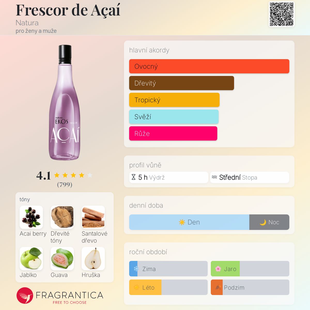 Frescor de Açaí podle Natura je Chypre Fruity vůně pro ženy a muže. Frescor de Açaí byl/a uveden/a v roce 2009. Frescor de Açaí byl/a vytvořen/a Odile Bongi a Verônica Kato. Vrchní tóny jsou Acai berry, Jablko, Guava, Hruška, Maliny, Meruňka, Citrón a Ananas; střední tóny jsouPivoňka, Frézie, Růže, Konvalinka a Fialka ; základní tóny jsou Santalové dřevo, Pižmo, Mandle, Jantar (ambra) a Kumarin.