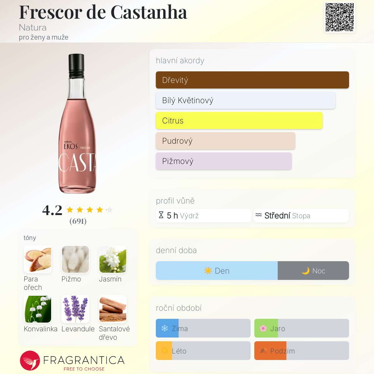 Frescor de Castanha podle Natura je Orientální Floral vůně pro ženy a muže. Frescor de Castanha byl/a uveden/a v roce 2009. "Nosem" za touto vůní je Verônica Kato. Vrchní tóny jsou Levandule, Zelené tóny, Bergamot, Pomeranč, Citrón a Mandarinka; střední tóny jsouJasmín, Konvalinka a Ylang-Ylang ; základní tóny jsou Para ořech, Pižmo, Santalové dřevo, Cedr a Dubový mech.