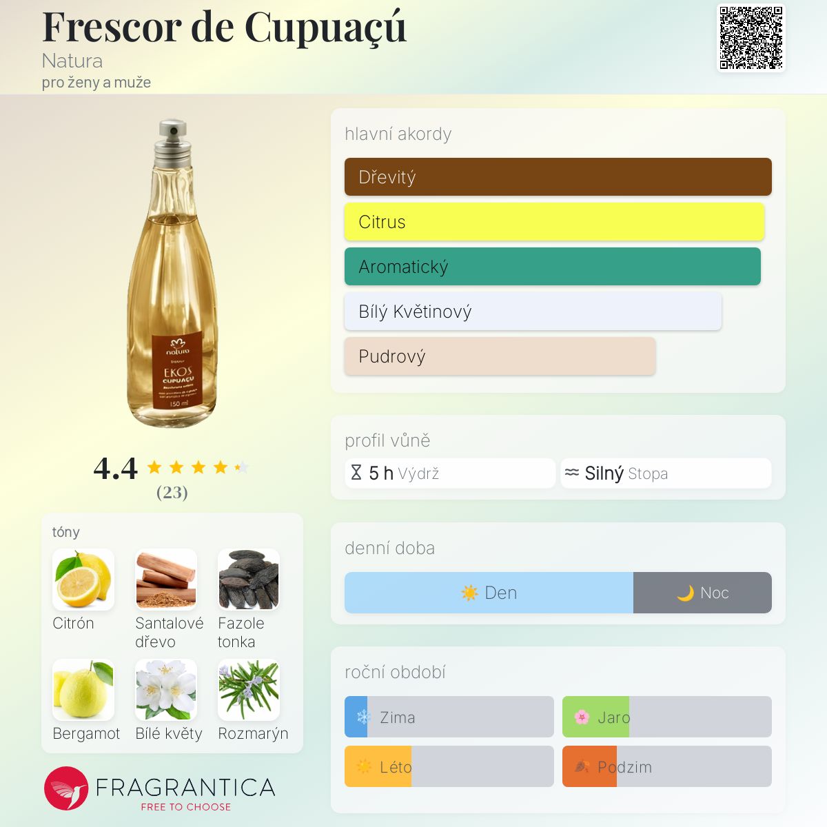 Frescor de Cupuaçú podle Natura je Orientální Woody vůně pro ženy a muže. Frescor de Cupuaçú byl/a uveden/a v roce 2008. "Nosem" za touto vůní je Verônica Kato. Vrchní tóny jsou Citrón, Bergamot, Rozmarýn, Pomeranč a Máta; střední tóny jsouBílé květy, Jasmín, Fialka a Konvalinka ; základní tóny jsou Santalové dřevo, Fazole tonka, Pižmo, Vetiver a Iso E Super.