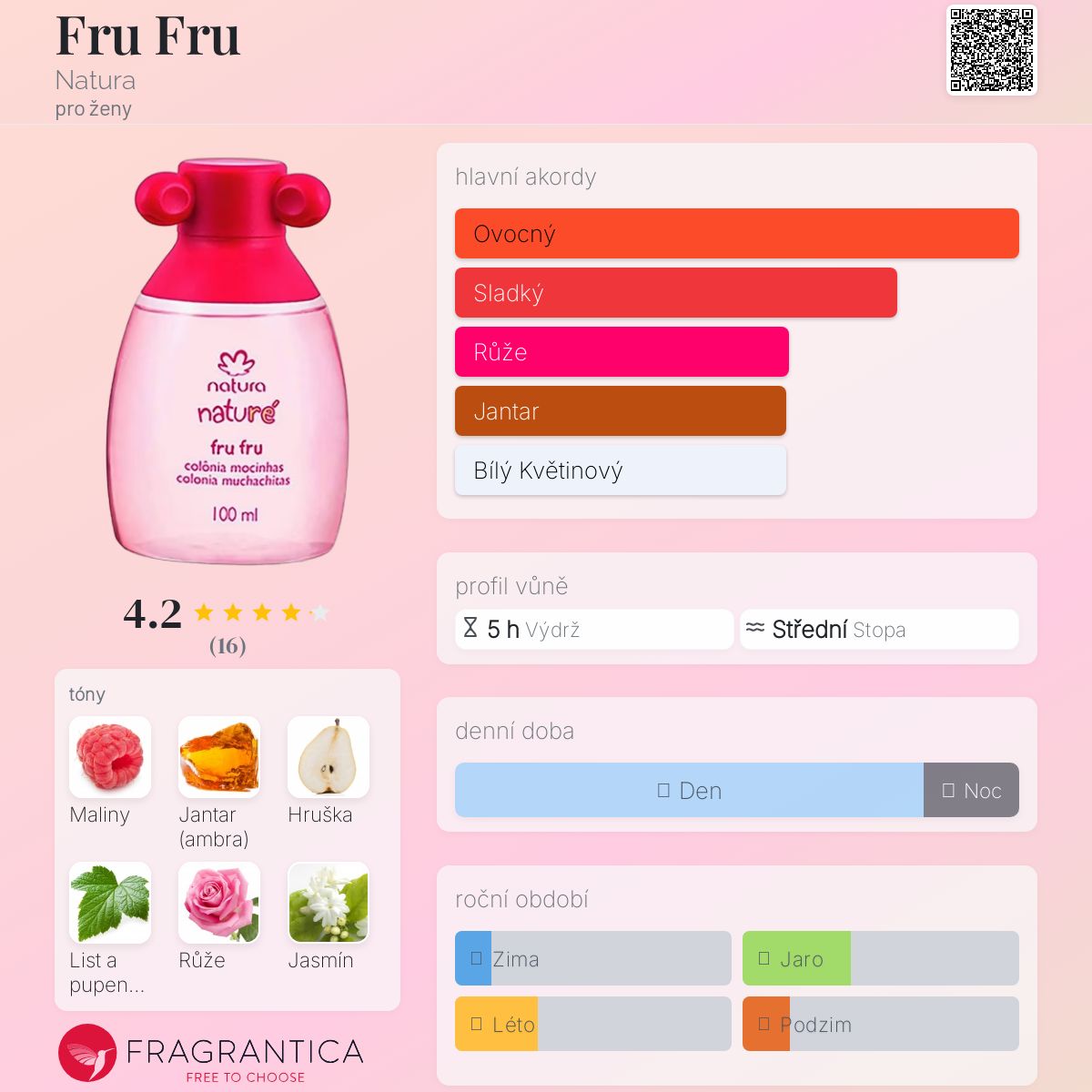 Fru Fru podle Natura je Floral Fruity vůně pro ženy. Fru Fru byl/a uveden/a v roce 2009. "Nosem" za touto vůní je Verônica Kato. Vrchní tóny jsou Maliny, Hruška a Černý rybíz; střední tóny jsouRůže, Jasmín a Konvalinka ; základní tóny jsou Jantar (ambra), Pižmo a Mech.