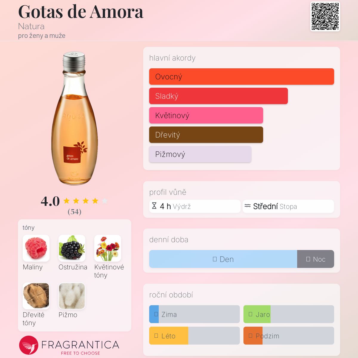 Gotas de Amora podle Natura je Floral Woody Musk vůně pro ženy a muže. Vrchní tóny jsou Maliny a Ostružina; střední tón jeKvětinové tóny ; základní tóny jsou Dřevité tóny a Pižmo.
