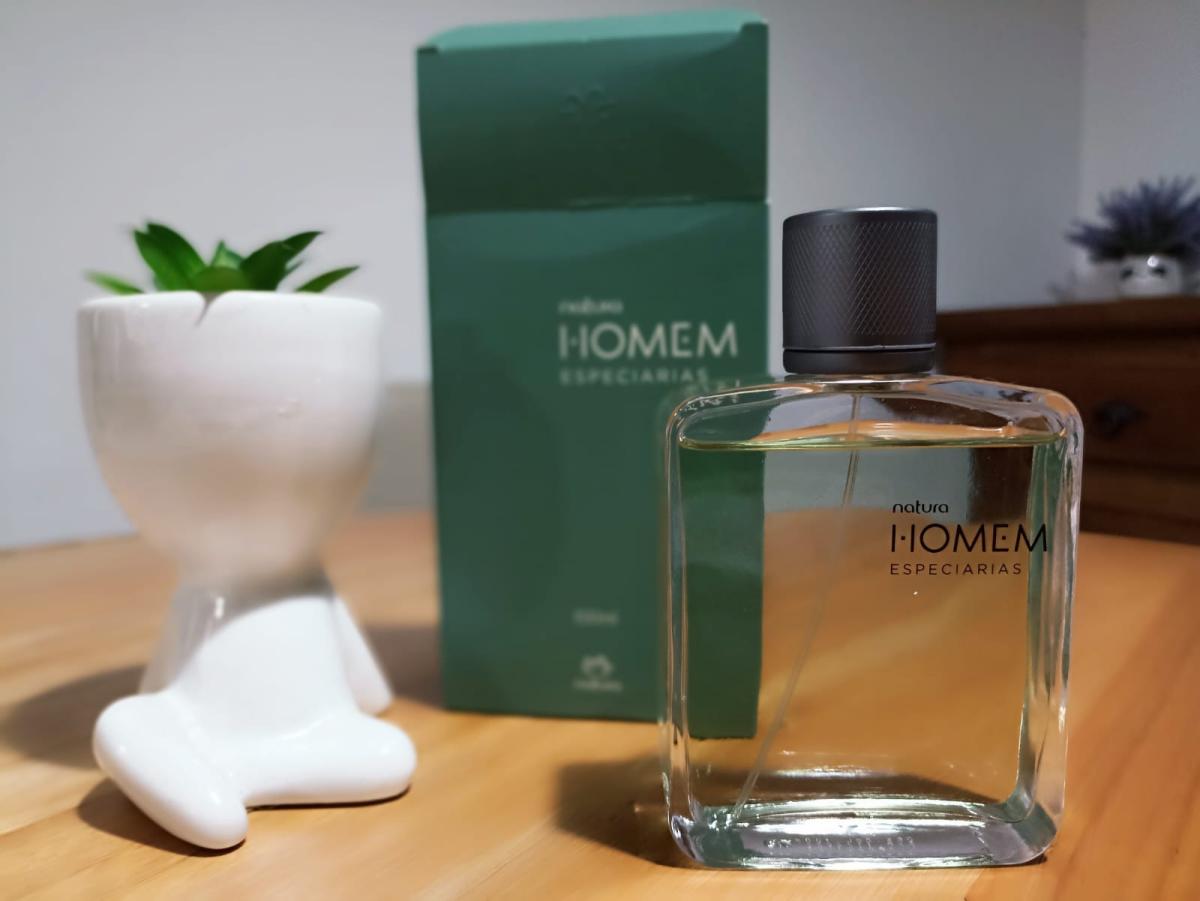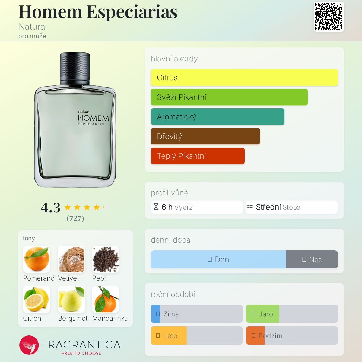 Homem Especiarias podle Natura je Woody Spicy vůně pro muže. Homem Especiarias byl/a uveden/a v roce 2016. "Nosem" za touto vůní je Verônica Kato. Vrchní tóny jsou Pomeranč, Citrón, Bergamot, Mandarinka, Grapefruit a List rebarbory; střední tóny jsouBílý pepř, Černý pepř, Zázvor, Muškátový oříšek, Koriandr, Elimi a Pelargónie ; základní tóny jsou Vetiver, Cedr, Pačuli, Pižmo a Benzoin.
