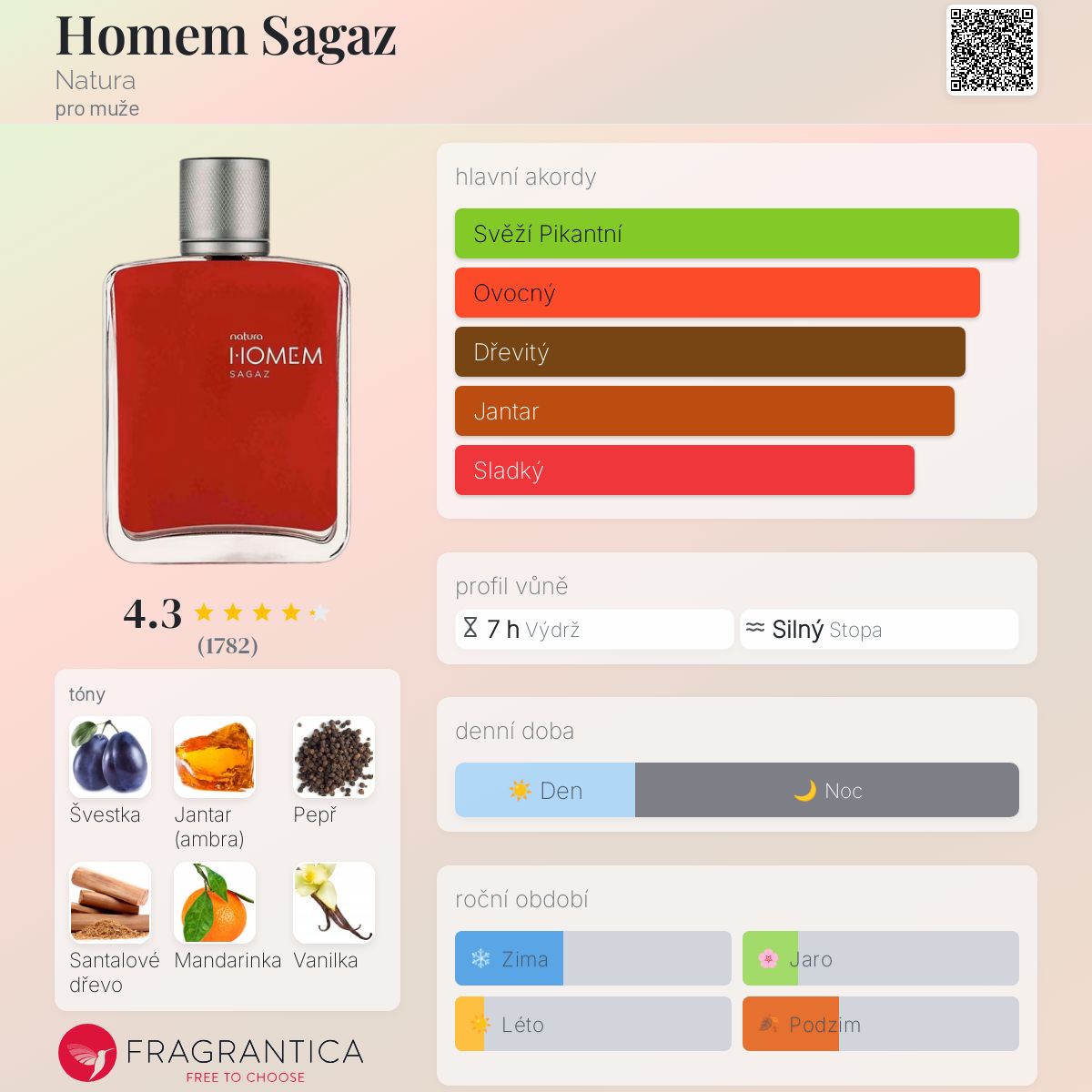 Homem Sagaz podle Natura je Aromatic Spicy vůně pro muže. Homem Sagaz byl/a uveden/a v roce 2017. Homem Sagaz byl/a vytvořen/a Verônica Kato a Antoine Maisondieu. Vrchní tóny jsou Zelená mandarinka, Šalvěj, Meduňka a Cypřiš; střední tóny jsouŠvestka, Černý pepř a Muškátový oříšek ; základní tóny jsou Jantar (ambra), Santalové dřevo, Vanilka, Fazole tonka a Cedr.