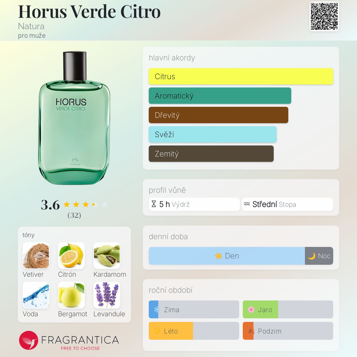 Horus Verde Citro podle Natura je Citrus Aromatic vůně pro muže. Horus Verde Citro byl/a uveden/a v roce 2012. "Nosem" za touto vůní je Verônica Kato. Vrchní tóny jsou Sicilský citron, Kardamom, Vodnaté tóny a Bergamot; střední tóny jsouVetiver, Levandule, Pepř a Cedr ; základní tóny jsou Santalové dřevo, Mech, Jantar (ambra), Kůže a Pižmo.