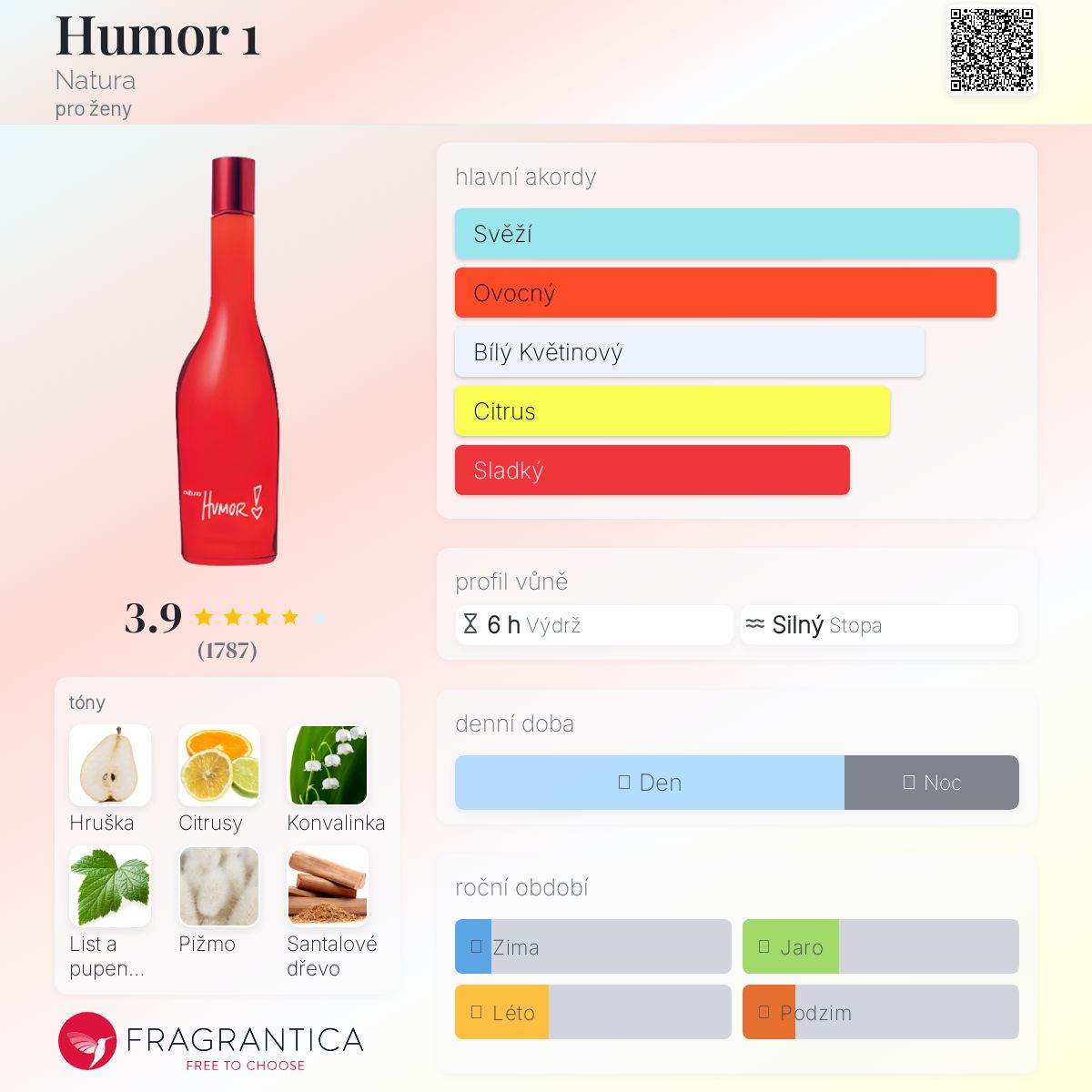 Humor 1 podle Natura je Floral Fruity vůně pro ženy. Humor 1 byl/a uveden/a v roce 2006. Humor 1 byl/a vytvořen/a Klara Ravat a Verônica Kato. Vrchní tóny jsou Hruška, Citrusy a Černý rybíz; střední tóny jsouKonvalinka, Jasmín a Para ořech ; základní tóny jsou Pižmo, Santalové dřevo a Jantar (ambra).