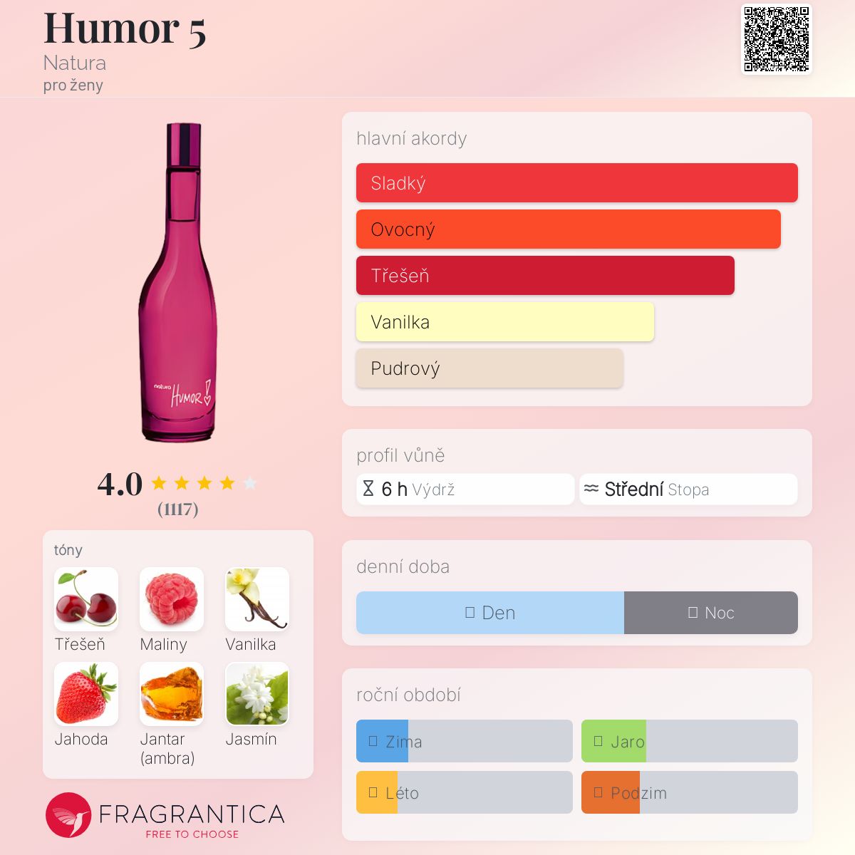 Humor 5 podle Natura je Floral Fruity vůně pro ženy. Humor 5 byl/a uveden/a v roce 2009. "Nosem" za touto vůní je Magali Lara. Vrchní tóny jsou Třešeň, Maliny a Velká jahoda; střední tóny jsouJasmín, Otočník a Konvalinka ; základní tóny jsou Vanilka, Jantar (ambra) a Santalové dřevo.