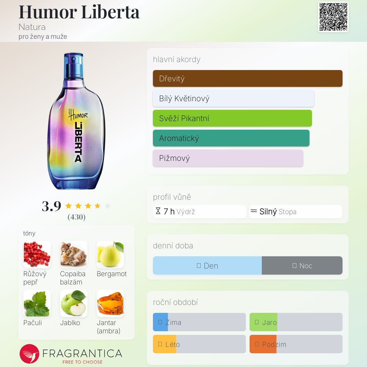 Humor Liberta podle Natura je Aromatic Spicy vůně pro ženy a muže. Humor Liberta byl/a uveden/a v roce 2022. Humor Liberta byl/a vytvořen/a Verônica Kato, Emilie Coppermann a Leslie Gauthier. Vrchní tóny jsou Růžový pepř, Bergamot a Jablko; střední tóny jsouKonvalinka, Pelargónie, Jasmín a Kosatec ; základní tóny jsou Copaiba balzám, Pačuli, Jantar (ambra), Tahitský vetiver, Semiš a Pižmo.