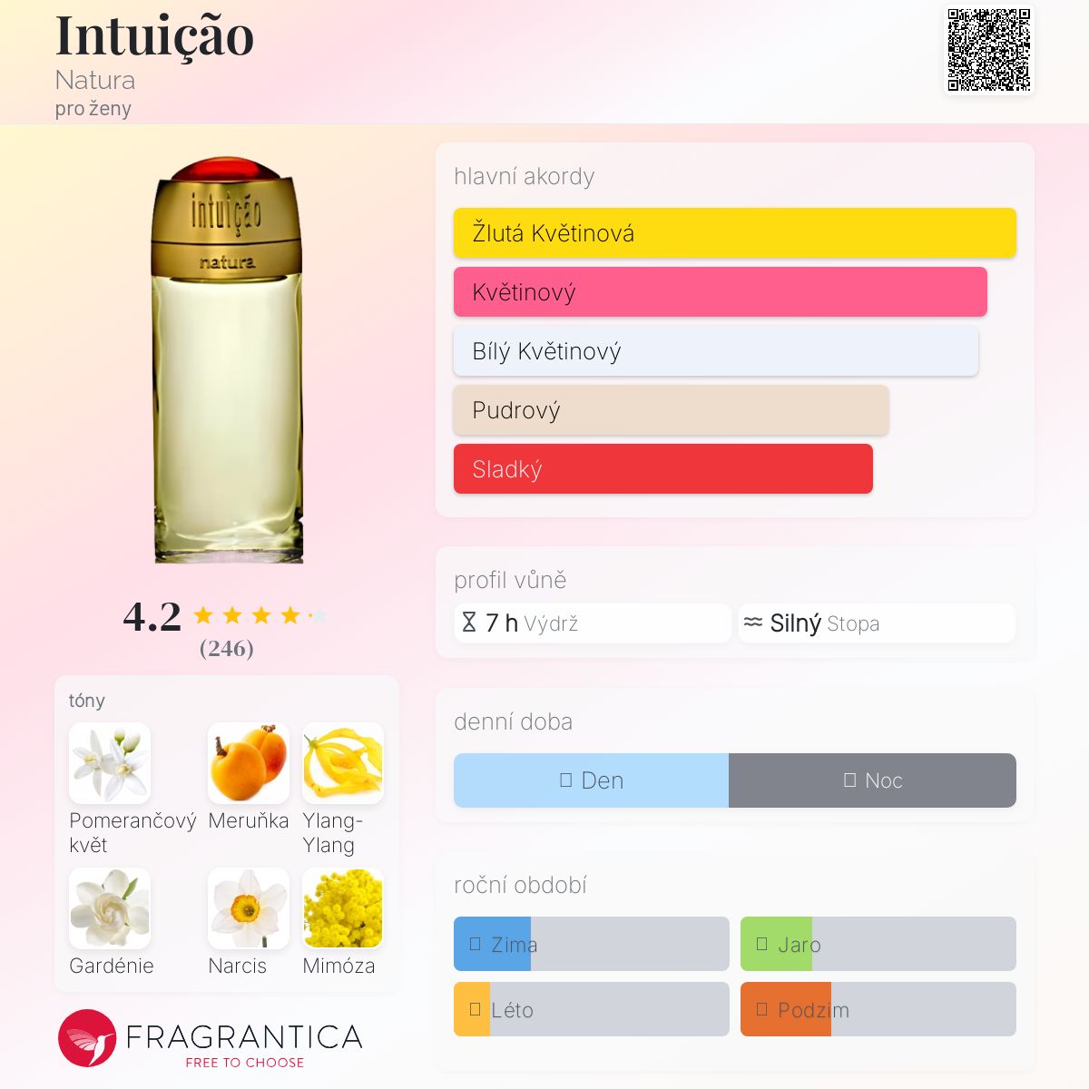 Intuição podle Natura je Floral vůně pro ženy. Intuição byl/a uveden/a v roce 1998. "Nosem" za touto vůní je Verônica Kato. Vrchní tóny jsou Pomerančový květ, Ylang-Ylang, Narcis, Frézie a Vonokvětka; střední tóny jsouMeruňka, Gardénie, Mimóza, Kosatec a Pivoňka ; základní tóny jsou Pižmo, Dubový mech a Dřevité tóny.