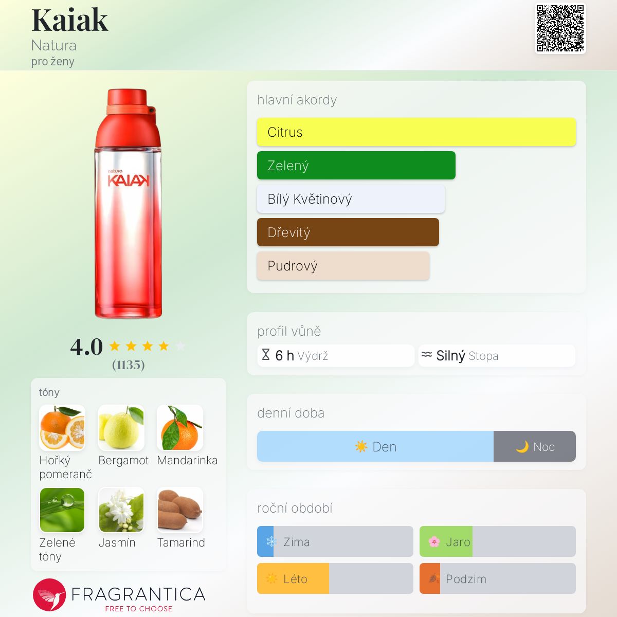 Kaiak podle Natura je Floral Fruity vůně pro ženy. Kaiak byl/a uveden/a v roce 2003. Vrchní tóny jsou Hořký pomeranč, Bergamot, Mandarinka, Zelené tóny, Tamarind, Švestka a Černý rybíz; střední tóny jsouJasmín, Konvalinka, Růžový pepř a Orchidej ; základní tóny jsou Pižmo, Virginský cedr, Santalové dřevo a Otočník.