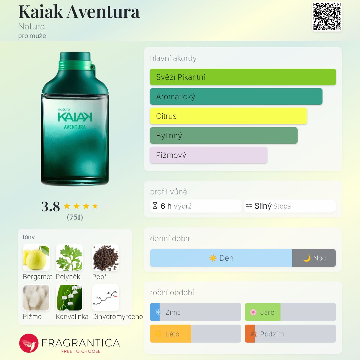 Kaiak Aventura podle Natura je Aromatic vůně pro muže. Kaiak Aventura byl/a uveden/a v roce 2003. Vrchní tóny jsou Bergamot, Pelyněk a Černý rybíz; střední tóny jsouČerný pepř, Konvalinka a Dihydromyrcenol ; základní tóny jsou Pižmo, Jantar (ambra) a Santalové dřevo.