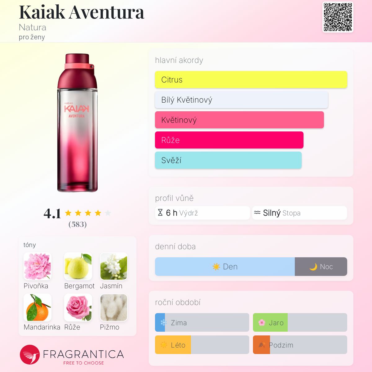 Kaiak Aventura podle Natura je Floral vůně pro ženy. Kaiak Aventura byl/a uveden/a v roce 2017. Kaiak Aventura byl/a vytvořen/a Verônica Kato a Natasha Côté. Vrchní tóny jsou Bergamot, Mandarinka, Zelené tóny, Ozonové tóny, Grapefruit a Růžový pepř; střední tóny jsouPivoňka, Jasmín, Růže, Konvalinka a Lilie ; základní tóny jsou Pižmo, Santalové dřevo, Cedr a Jantar (ambra).