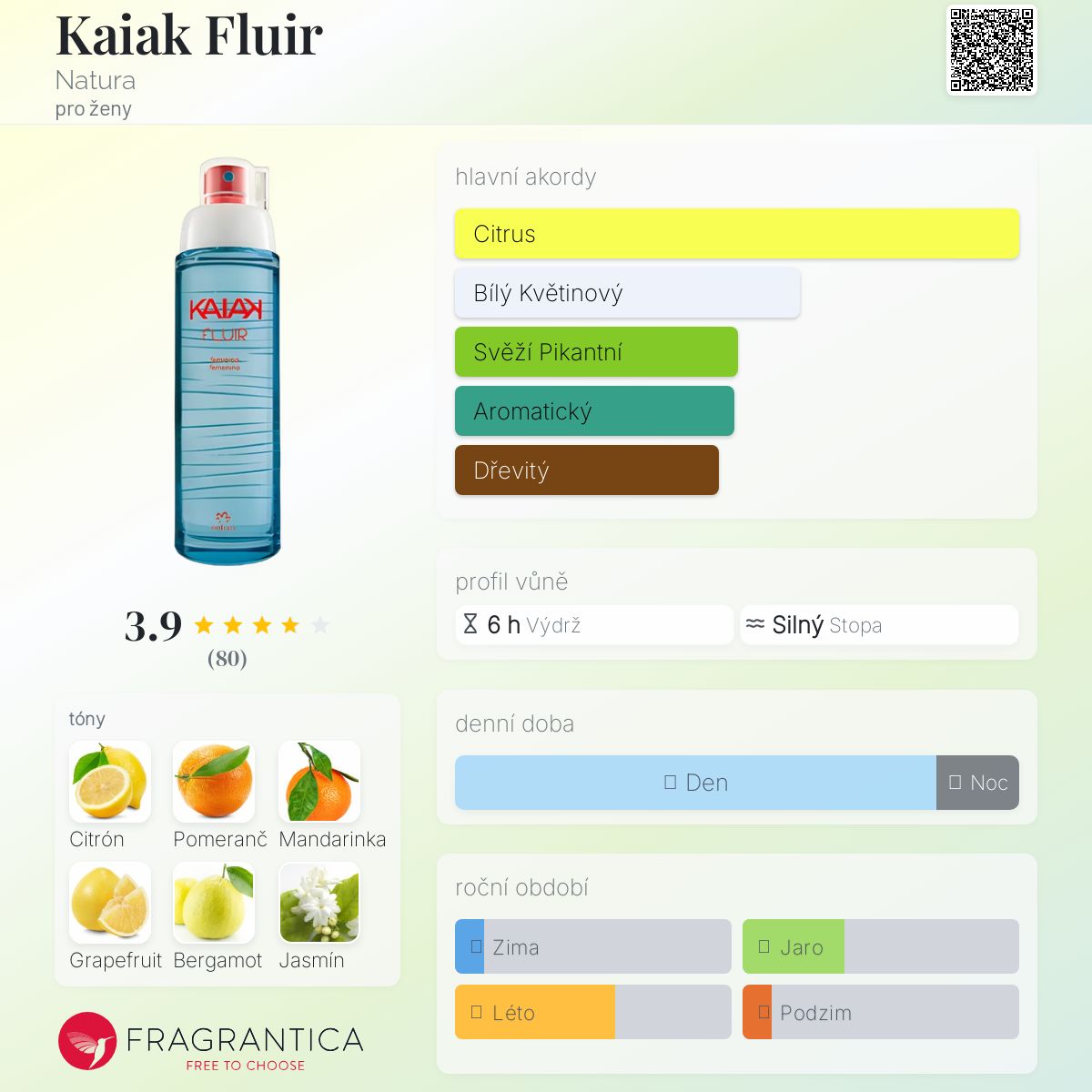 Kaiak Fluir podle Natura je Floral Green vůně pro ženy. Kaiak Fluir byl/a uveden/a v roce 2012. Vrchní tóny jsou Citrón, Pomeranč, Mandarinka, Grapefruit a Bergamot; střední tóny jsouJasmín, Bílá královská lilie, Gardénie a Růže ; základní tóny jsou Mech, Santalové dřevo a Pižmo.
