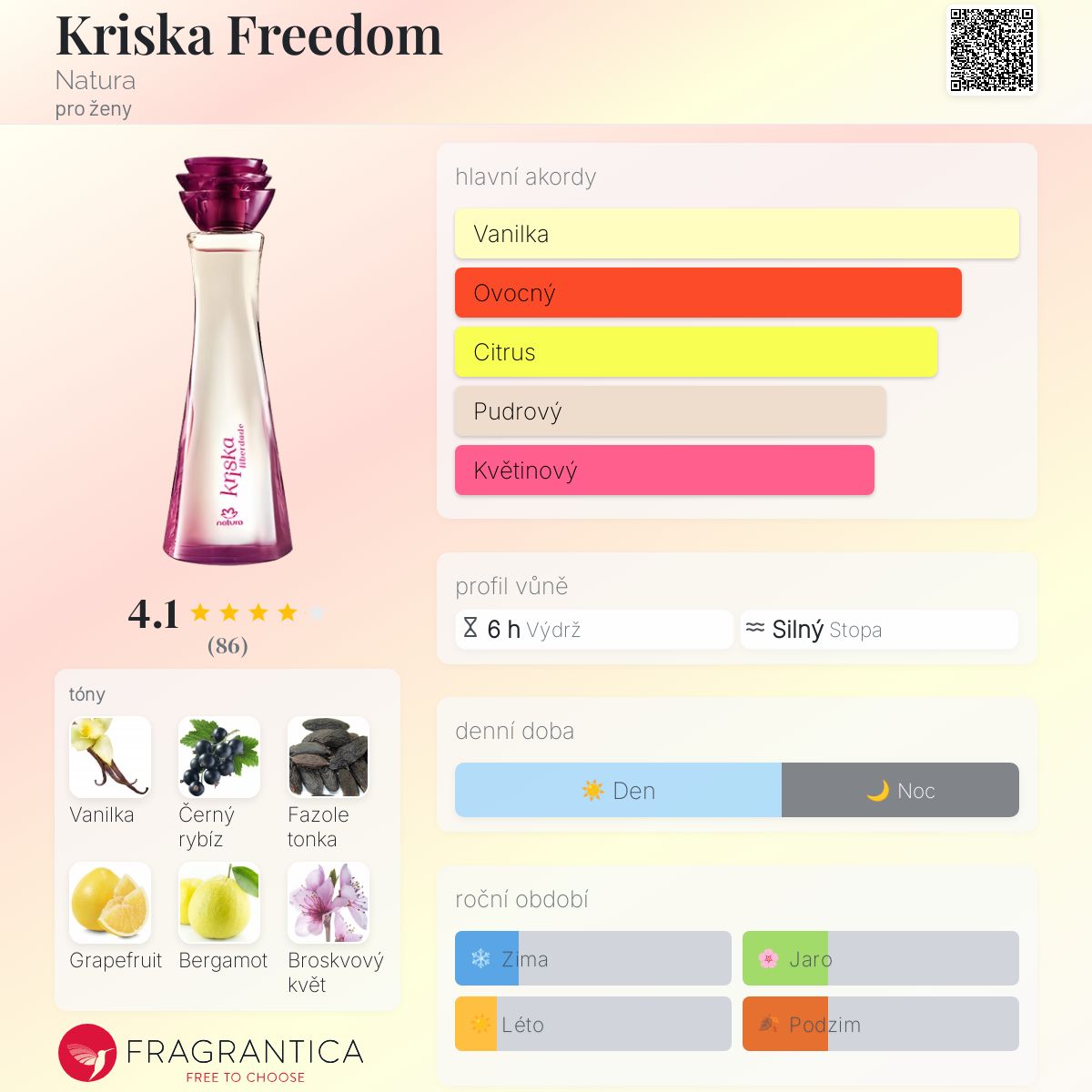 Kriska Freedom podle Natura je Floral Woody Musk vůně pro ženy. Kriska Freedom byl/a uveden/a v roce 2013. Vrchní tóny jsou Černý rybíz, Růžový grapefruit, Bergamot, Muškátový oříšek, Sicilský citron a Hruška; střední tóny jsouBroskvový květ, Jasmín, Kosatec a Extrakt z bílého cedru ; základní tóny jsou Vanilka, Fazole tonka, Jantar (ambra), Santalové dřevo a Pižmo.