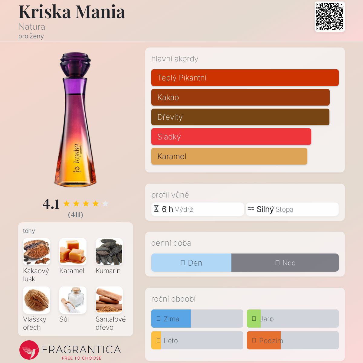 Kriska Mania podle Natura je Floral Fruity Gourmand vůně pro ženy. Kriska Mania byl/a uveden/a v roce 2019. Vrchní tóny jsou Sůl, Kardamom, Růžový pepř a Mandarinka; střední tóny jsouKumarin, Vlašský ořech, Gardénie a Magnólie ; základní tóny jsou Kakao, Karamel, Sůl, Santalové dřevo, Jantarové dřevo, Cedr a Pižmo.