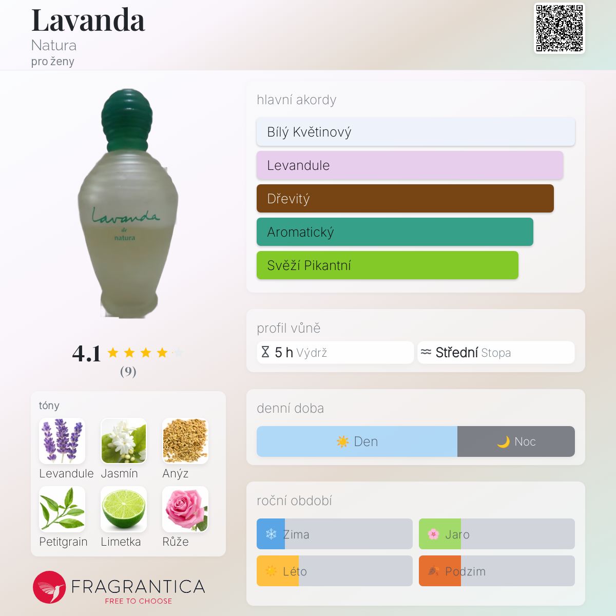Lavanda podle Natura je Floral vůně pro ženy. Lavanda byla spuštěna během 1990. Vrchní tóny jsou Levandule, Anýz, Petitgrain a Limetka; střední tóny jsouJasmín, Růže, Fialkové listy, Konvalinka a Muškátový oříšek ; základní tóny jsou Pižmo, Santalové dřevo, Pačuli, Vetiver a Dubový mech.