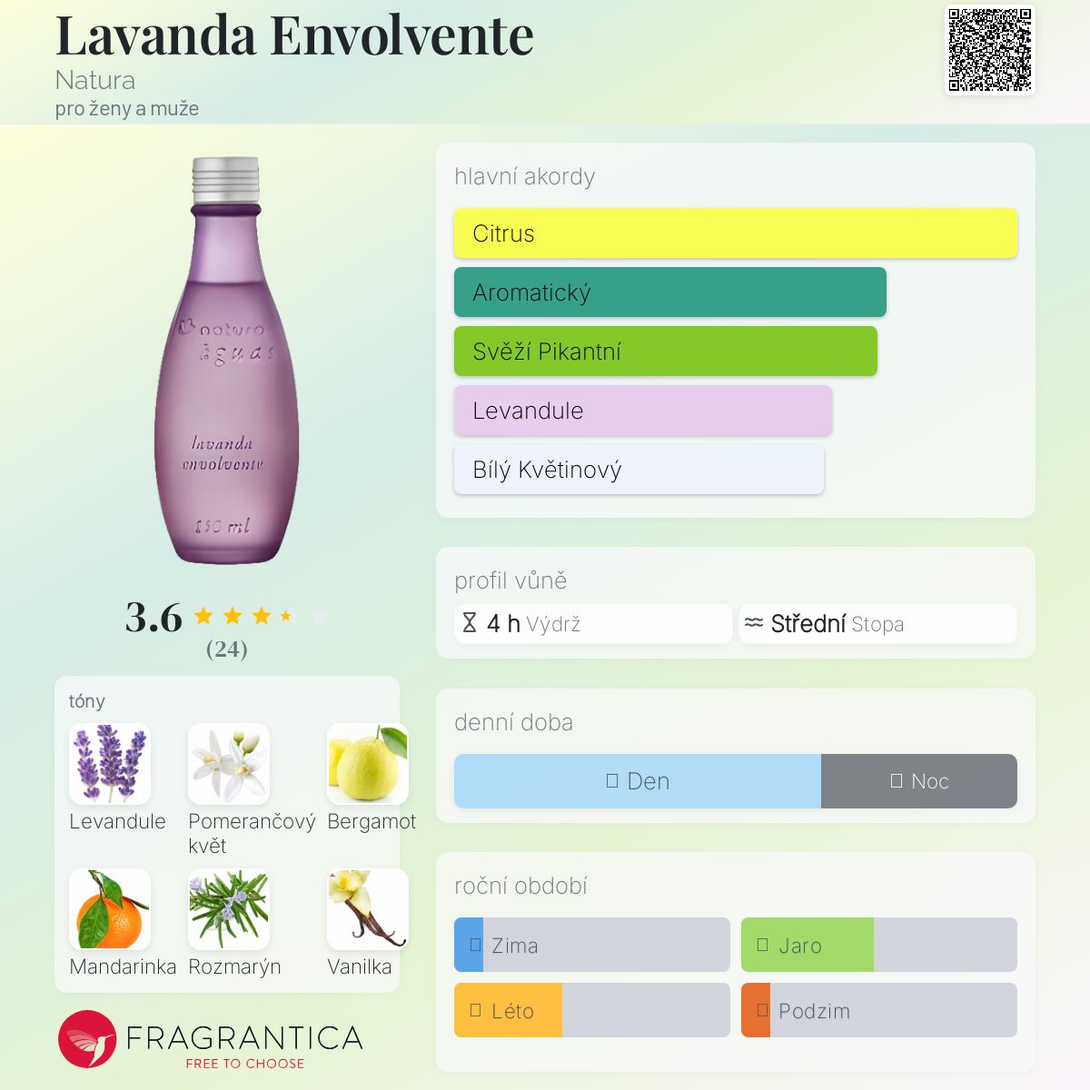 Lavanda Envolvente podle Natura je Aromatic Fougere vůně pro ženy a muže. Lavanda Envolvente byl/a uveden/a v roce 2011. "Nosem" za touto vůní je Napoleao Bastos. Vrchní tóny jsou Bergamot, Mandarinka a Rozmarýn; střední tóny jsouLevandule a Pomerančový květ ; základní tóny jsou Vanilka, Pižmo a Benzoin.