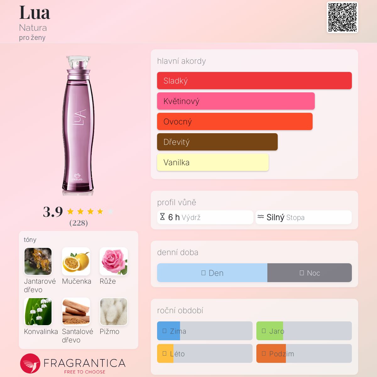 Lua podle Natura je Floral Fruity vůně pro ženy. Lua byl/a uveden/a v roce 2012. Lua byl/a vytvořen/a Verônica Kato a Francisco Marano. Vrchní tóny jsou Mučenka, Meruňka, Citrón, Mandarinka, Bergamot a Ananas; střední tóny jsouRůže, Konvalinka, Frézie a Pivoňka ; základní tóny jsou Jantarové dřevo, Santalové dřevo a Pižmo.