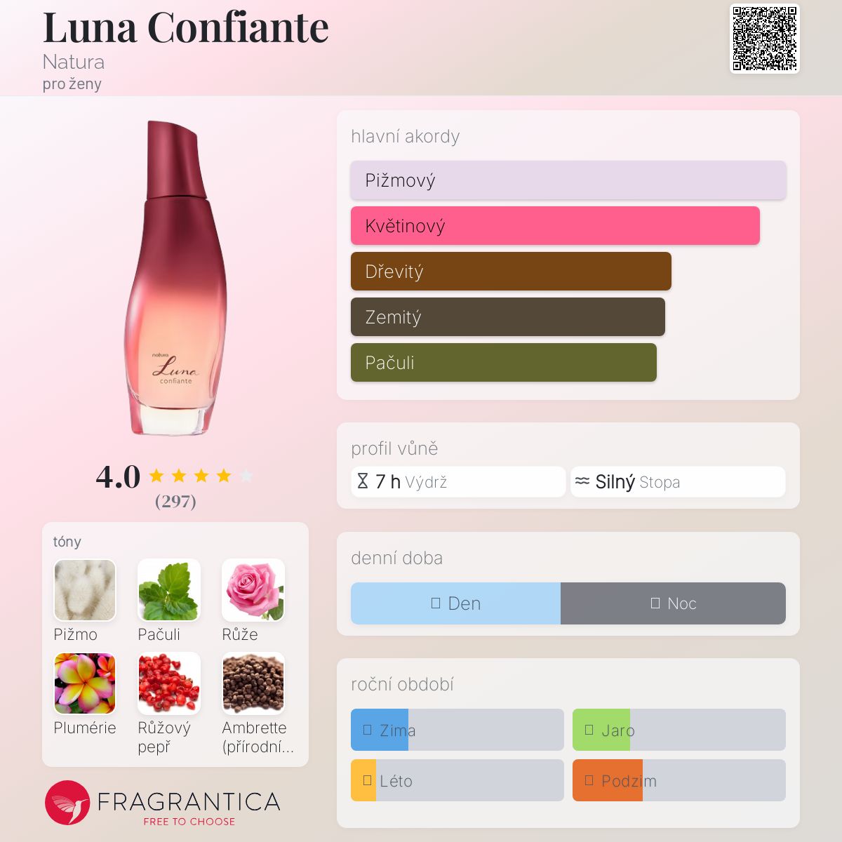 Luna Confiante podle Natura je Chypre Floral vůně pro ženy. Luna Confiante byl/a uveden/a v roce 2021. Luna Confiante byl/a vytvořen/a Verônica Kato a Domitille Michalon Bertier. Vrchní tóny jsou Růžový pepř, Hruška a Bergamot; střední tóny jsouRůže, Plumérie, Frézie, Jasmín a Konvalinka ; základní tóny jsou Pižmo, Pačuli, Ambrette (přírodní pižmo), Mech a Vetiver.