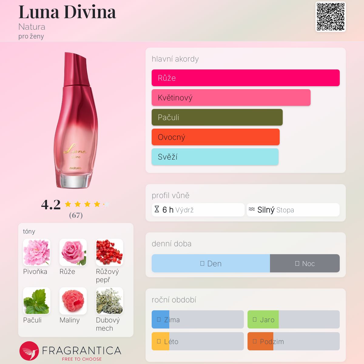 Luna Divina podle Natura je Chypre vůně pro ženy. Toto je nová vůně. Luna Divina byl/a uveden/a v roce 2025. "Nosem" za touto vůní je Verônica Kato. Vrchní tóny jsou Růžový pepř a Maliny; střední tóny jsouPivoňka a Růže ; základní tóny jsou Pačuli a Mech.