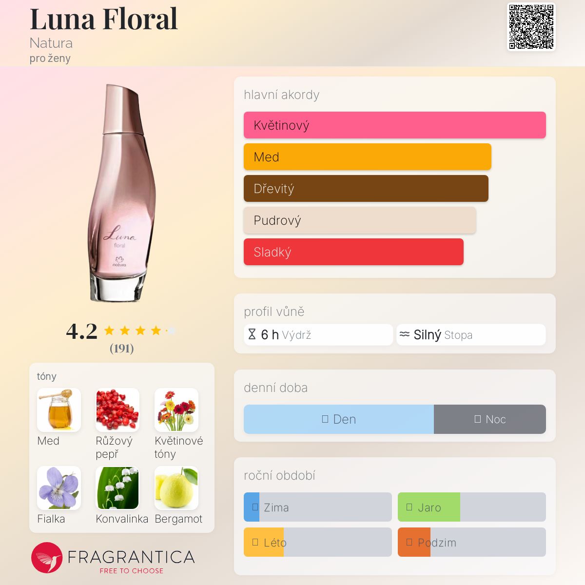 Luna Floral podle Natura je Chypre vůně pro ženy. Luna Floral byl/a uveden/a v roce 2017. Vrchní tóny jsou Růžový pepř, Bergamot a Červené ovoce; střední tóny jsouMed, Květinové tóny, Fialka a Konvalinka ; základní tóny jsou Pačuli, Cedr a Pižmo.