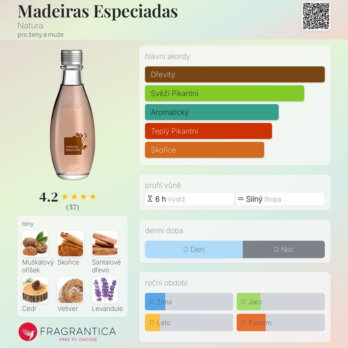 Madeiras Especiadas podle Natura je Woody vůně pro ženy a muže. Madeiras Especiadas byl/a uveden/a v roce 2011. Vrchní tóny jsou Levandule, Pelyněk a Bergamot; střední tóny jsouMuškátový oříšek a Skořice ; základní tóny jsou Santalové dřevo, Cedr a Vetiver.