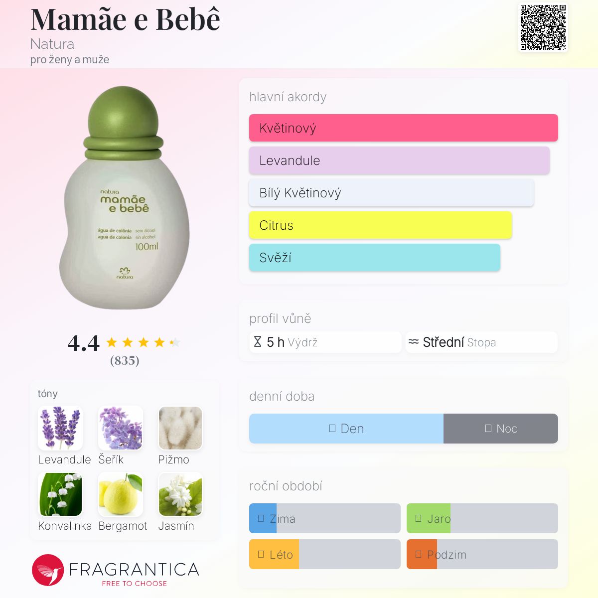 Mamãe e Bebê podle Natura je Orientální Floral vůně pro ženy a muže. Mamãe e Bebê byl/a uveden/a v roce 1993. "Nosem" za touto vůní je Francisco Marano. Vrchní tóny jsou Levandule, Bergamot a Mandarinka; střední tóny jsouŠeřík, Konvalinka a Jasmín ; základní tóny jsou Pižmo, Vanilka, Santalové dřevo a Exotická dřeva.