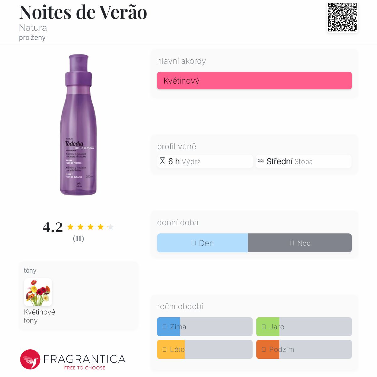 Noites de Verão podle Natura je Floral vůně pro ženy. Toto je nová vůně. Noites de Verão byl/a uveden/a v roce 2025. "Nosem" za touto vůní je Verônica Kato.
