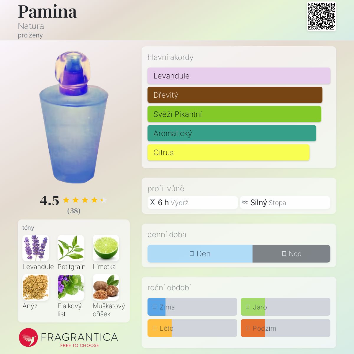 Pamina podle Natura je Floral vůně pro ženy. Pamina byl/a uveden/a v roce 1999. Vrchní tóny jsou Levandule, Petitgrain, Limetka a Anýz; střední tóny jsouFialkové listy, Indonéský muškátový oříšek, Jasmín, Bulharská růže a Konvalinka ; základní tóny jsou Santalové dřevo, List indonéského pačuli, Vetiver a Srbský dubový mech.