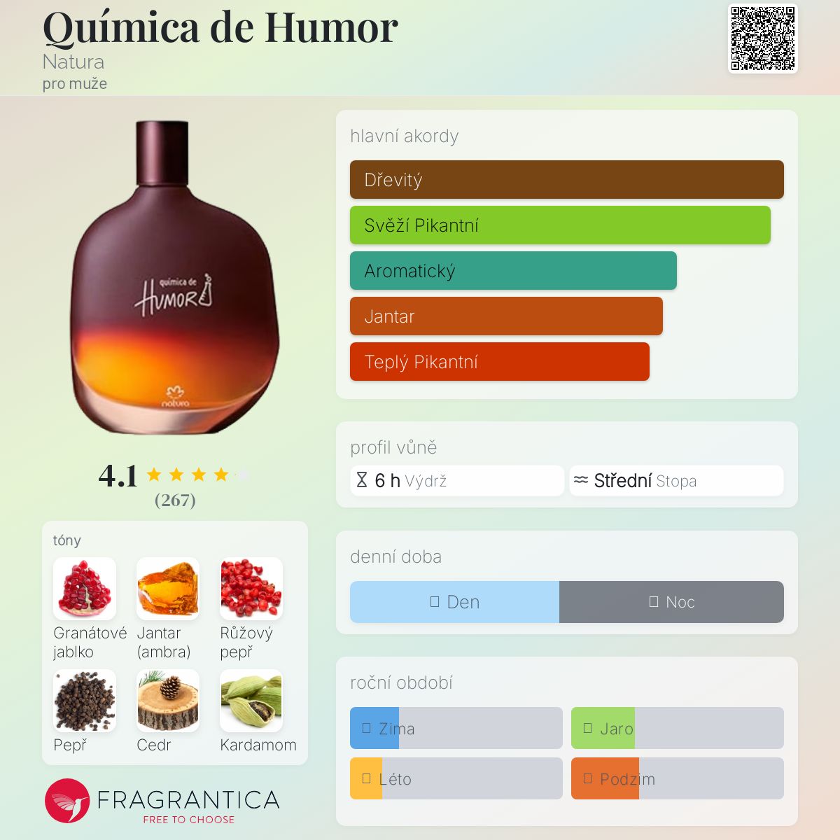Química de Humor podle Natura je Woody Aromatic vůně pro muže. Química de Humor byl/a uveden/a v roce 2019. Química de Humor byl/a vytvořen/a Verônica Kato a Jean-Christophe Hérault. Vrchní tóny jsou Granátové jablko, Růžový pepř, Pepř, Kardamom, Zázvor, Priprioca, Grapefruit a Bazalka; střední tóny jsouCedr, Fialka, Koriandr a Levandule ; základní tóny jsou Jantar (ambra), Cedr, Pačuli, Copaiba balzám a Labdanum.