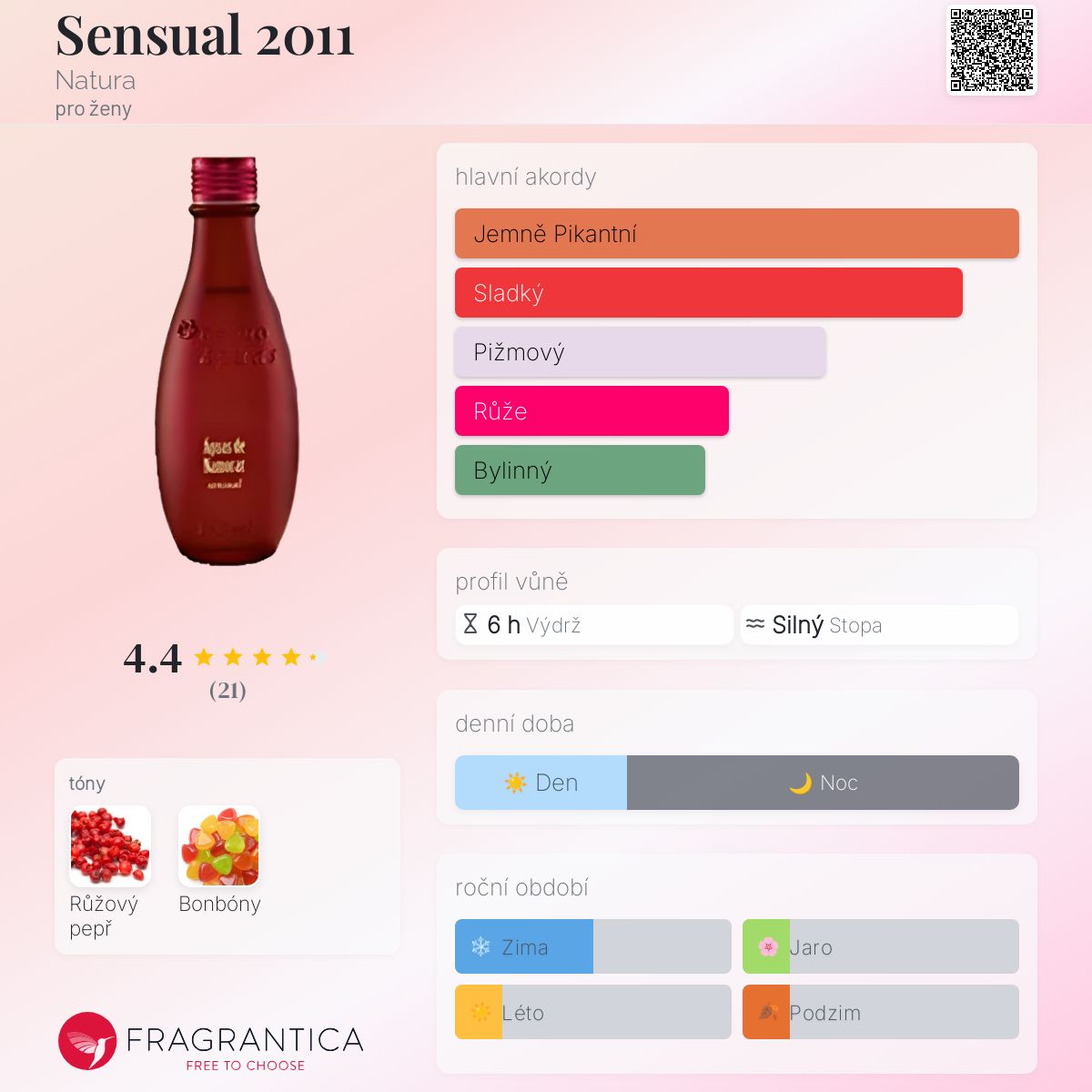 Sensual 2011 podle Natura je Orientální Spicy vůně pro ženy. Sensual 2011 byl/a uveden/a v roce 2011. "Nosem" za touto vůní je Verônica Kato.