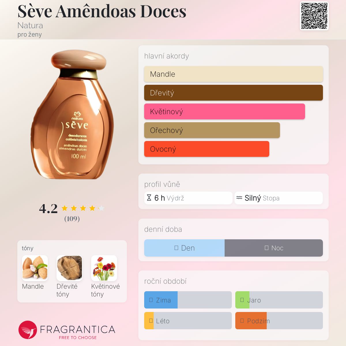 Sève Amêndoas Doces podle Natura je Floral vůně pro ženy. Sève Amêndoas Doces byl/a uveden/a v roce 2012. "Nosem" za touto vůní je Verônica Kato. základní tóny jsou Sladká mandle, Dřevité tóny a Květinové tóny.