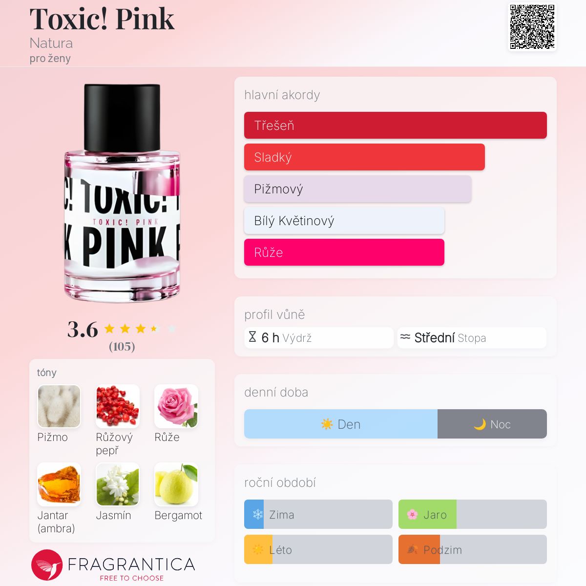 Toxic! Pink podle Natura je Floral Fruity Gourmand vůně pro ženy. Toxic! Pink byl/a uveden/a v roce 2017. Toxic! Pink byl/a vytvořen/a Verônica Kato a Sonia Constant. Vrchní tóny jsou Růžový pepř, Bergamot a Mandarinka; střední tóny jsouRůže, Jasmín a Konvalinka ; základní tóny jsou Pižmo, Jantar (ambra) a Třešňový likér.