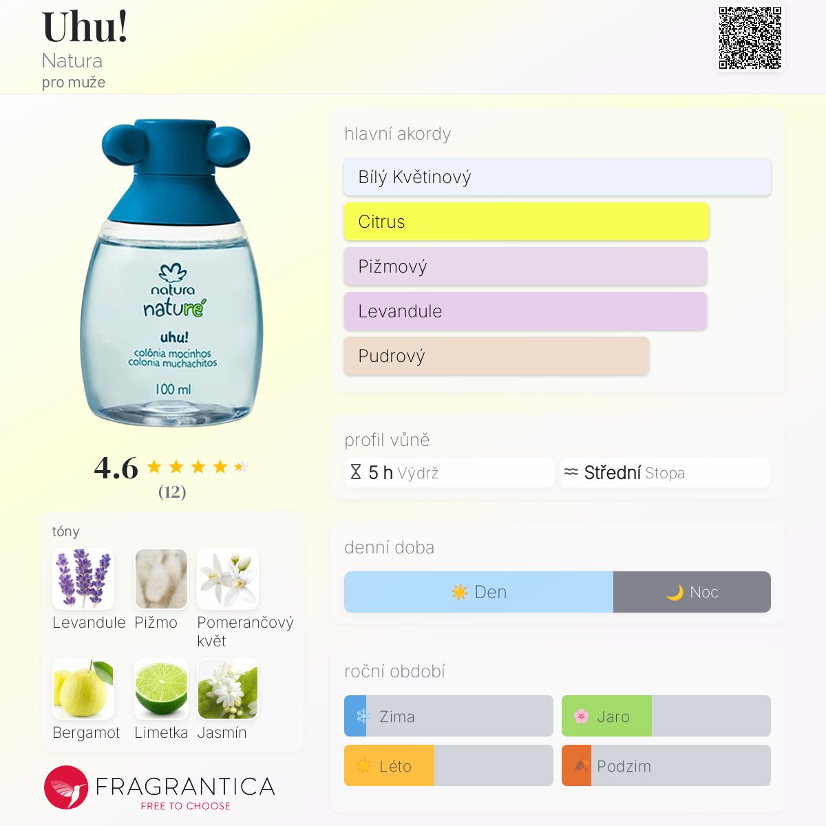 Uhu! podle Natura je Aromatic vůně pro muže. Uhu! byl/a uveden/a v roce 2009. "Nosem" za touto vůní je Verônica Kato. Vrchní tóny jsou Pomerančový květ, Bergamot a Limetka; střední tóny jsouLevandule, Jasmín a Konvalinka ; základní tóny jsou Pižmo, Vanilka a Cedr.