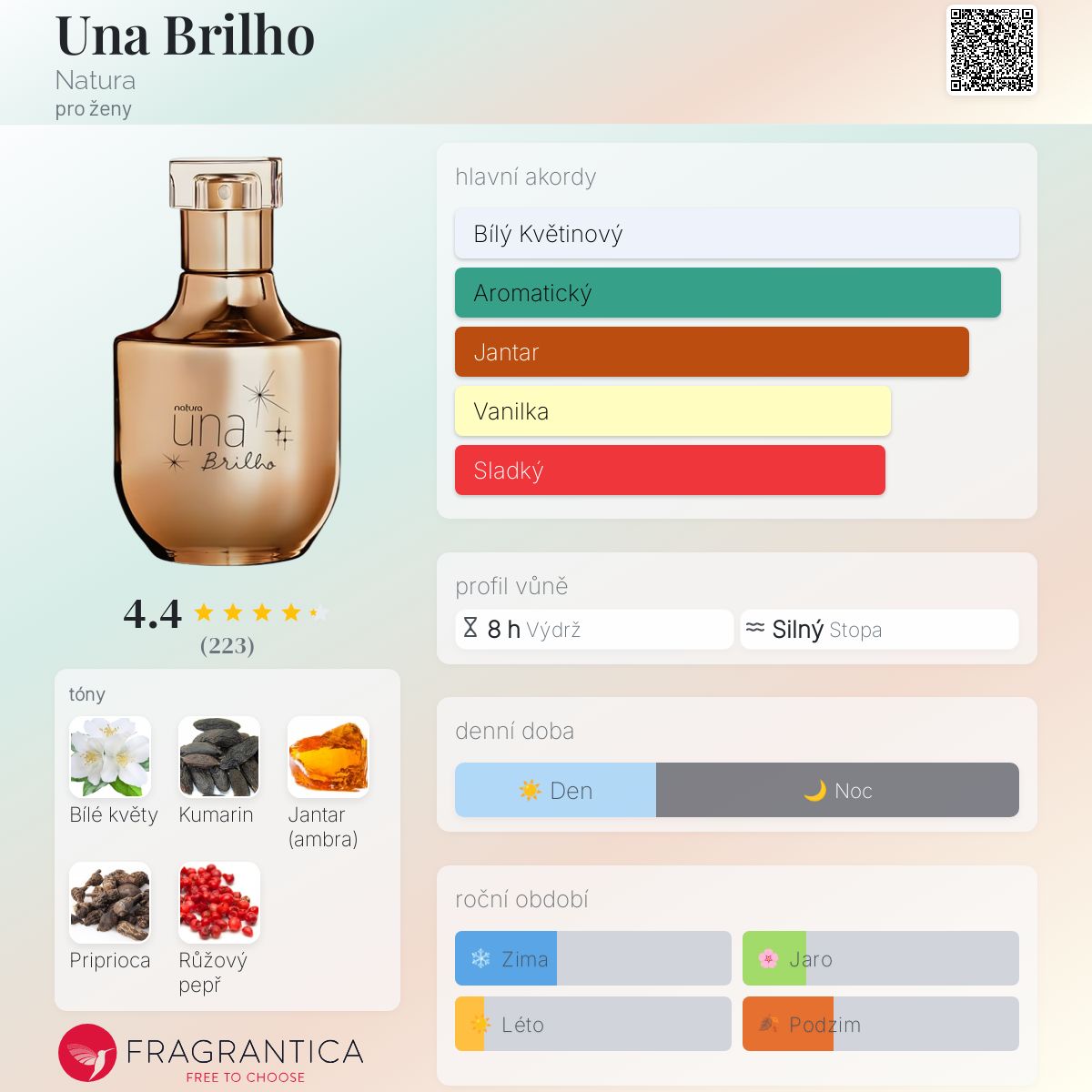 Una Brilho podle Natura je Orientální Floral vůně pro ženy. Toto je nová vůně. Una Brilho byl/a uveden/a v roce 2024. "Nosem" za touto vůní je Verônica Kato. Vrchní tóny jsou Priprioca a Růžový pepř; střední tón jeBílé květy ; základní tóny jsou Kumarin a Jantar (ambra).