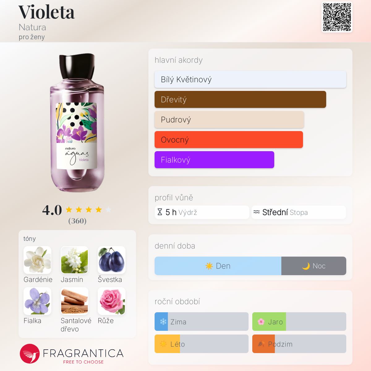 Violeta podle Natura je Floral vůně pro ženy. Violeta byl/a uveden/a v roce 1993. Violeta byl/a vytvořen/a Francisco Marano a Luis Tsukuda. Vrchní tóny jsou Švestka a Černý rybíz, Bergamot, Mandarinka a Černý rybíz; střední tóny jsouGardénie, Jasmín, Fialka, Růže a Ylang-Ylang ; základní tóny jsou Santalové dřevo, Pižmo, Cedr, Vetiver a Pačuli.