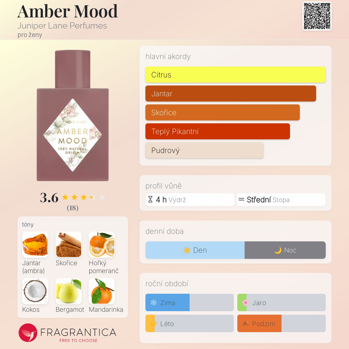 Amber Mood podle Nature Blossom je Orientální Floral vůně pro ženy. Amber Mood byl/a uveden/a v roce 2020. Vrchní tóny jsou Hořký pomeranč, Kokos, Bergamot a Mandarinka; střední tóny jsouPomerančový květ, Konvalinka a Otočník ; základní tóny jsou Jantar (ambra), Skořice, Vanilka, Santalové dřevo, Cedr a Hřebíček.