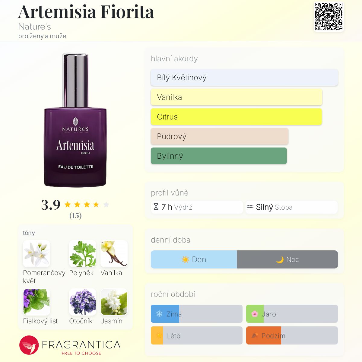Artemisia Fiorita podle Nature's je vůně pro ženy a muže. Toto je nová vůně. Artemisia Fiorita byl/a uveden/a v roce 2024. Vrchní tóny jsou Fialkový list, Grapefruit a Bergamot; střední tóny jsouPomerančový květ, Pelyněk, Otočník a Jasmín ; základní tóny jsou Vanilka, Dřevité tóny a Dubový mech.