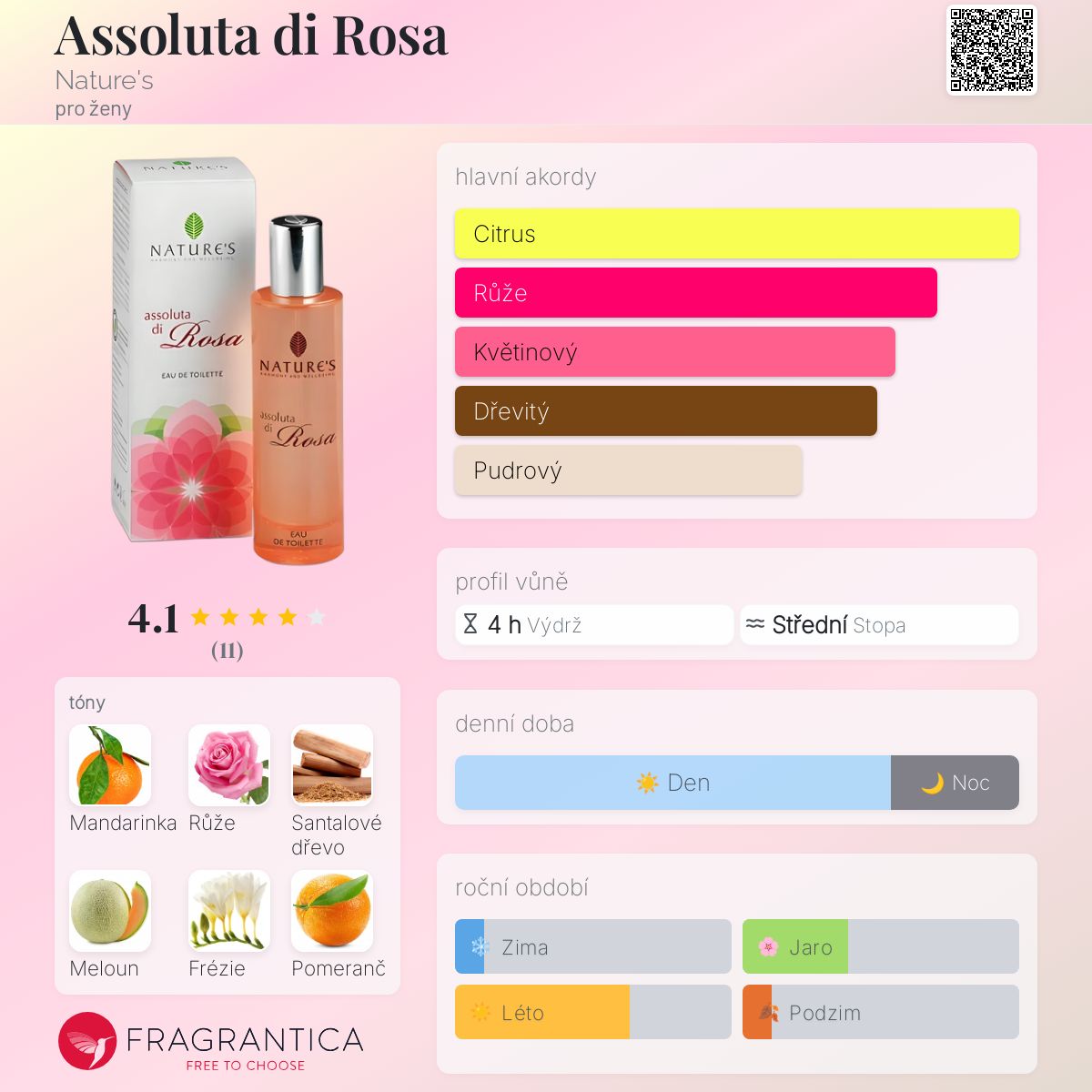 Assoluta di Rosa podle Nature's je Floral vůně pro ženy. Vrchní tóny jsou Mandarinka, Meloun a Pomeranč; střední tóny jsouBulharská růže, Frézie a Pivoňka ; základní tóny jsou Santalové dřevo a Toskánský kosatec.
