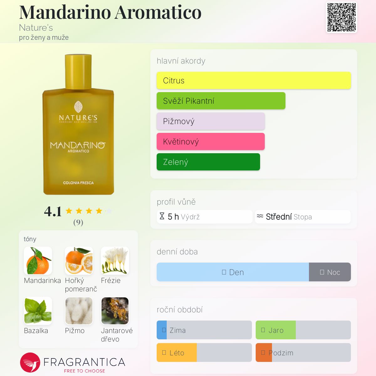 Mandarino Aromatico podle Nature's je Citrus Aromatic vůně pro ženy a muže. Toto je nová vůně. Mandarino Aromatico byl/a uveden/a v roce 2024. Vrchní tóny jsou Italská mandarinka, Žlutá mandarinka a Hořký pomeranč; střední tóny jsouFrézie, Bazalka a Černý pepř ; základní tóny jsou Pižmo, Jantarové dřevo a Santalové dřevo.