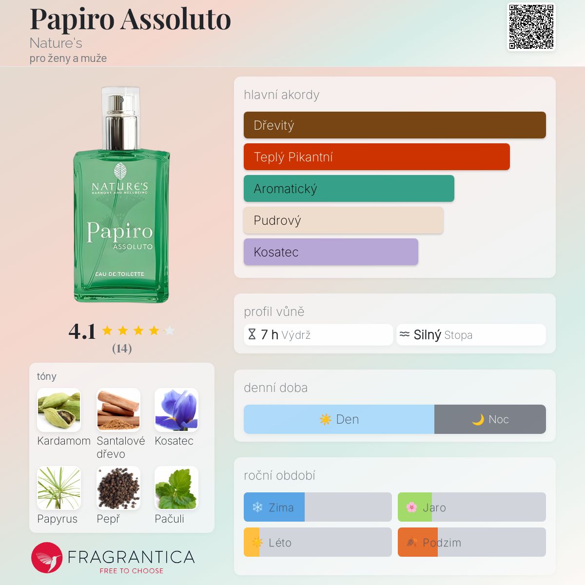 Papiro Assoluto podle Nature's je vůně pro ženy a muže. Toto je nová vůně. Papiro Assoluto byl/a uveden/a v roce 2024. Vrchní tóny jsou Kardamom, Kosatec, Černý pepř a Eukalyptus; střední tóny jsouPapyrus, Koriandr a Cedr ; základní tóny jsou Santalové dřevo, Pačuli, Fazole tonka a Bílé pižmo.