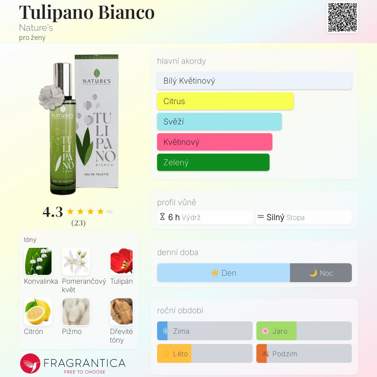 Tulipano Bianco podle Nature's je vůně pro ženy. Tulipano Bianco byl/a uveden/a v roce 2023. Vrchní tóny jsou Konvalinka a Citrón; střední tóny jsouPomerančový květ a Tulipán ; základní tóny jsou Bílé pižmo a Bílé dřevo.