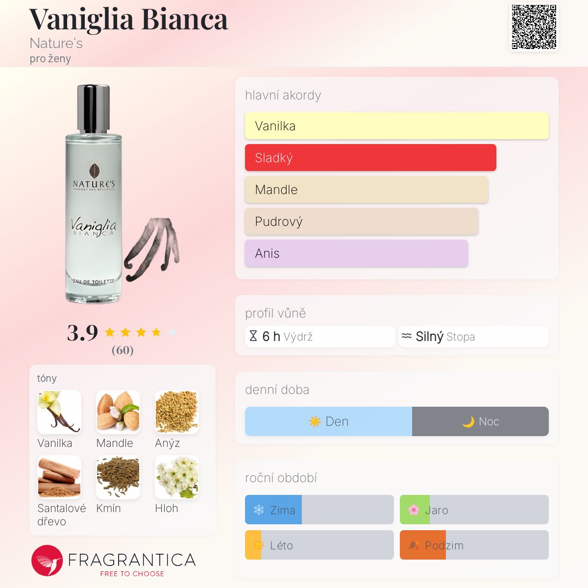 Vaniglia Bianca podle Nature's je Orientální Floral vůně pro ženy. Vrchní tóny jsou Hořká mandle, Anýz, Kmín a Bergamot; střední tóny jsouHloh, Jasmín a Tuberóza ; základní tóny jsou Vanilka, Santalové dřevo a Pižmo.