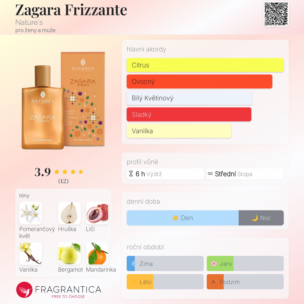 Zagara Frizzante podle Nature's je vůně pro ženy a muže. Zagara Frizzante byl/a uveden/a v roce 2022. Vrchní tóny jsou Liči, Bergamot a Mandarinka; střední tóny jsouPomerančový květ a Hruška ; základní tóny jsou Vanilka a Pačuli.