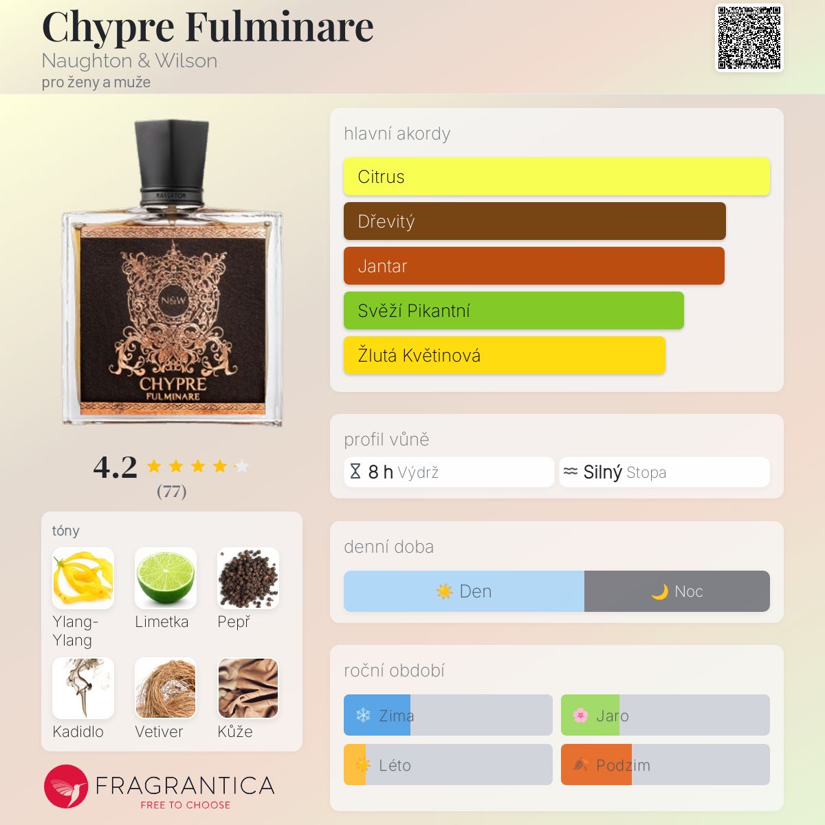 Chypre Fulminare podle Naughton & Wilson je Chypre vůně pro ženy a muže. Chypre Fulminare byl/a uveden/a v roce 2022. "Nosem" za touto vůní je John Stephen. Vrchní tóny jsou Ylang-Ylang, Limetka, Citrón a Pomeranč; střední tóny jsouPepř, Kadidlo a Kůže ; základní tóny jsou Vetiver, Dubový mech, Labdanum, Ambra a Kastoreum.