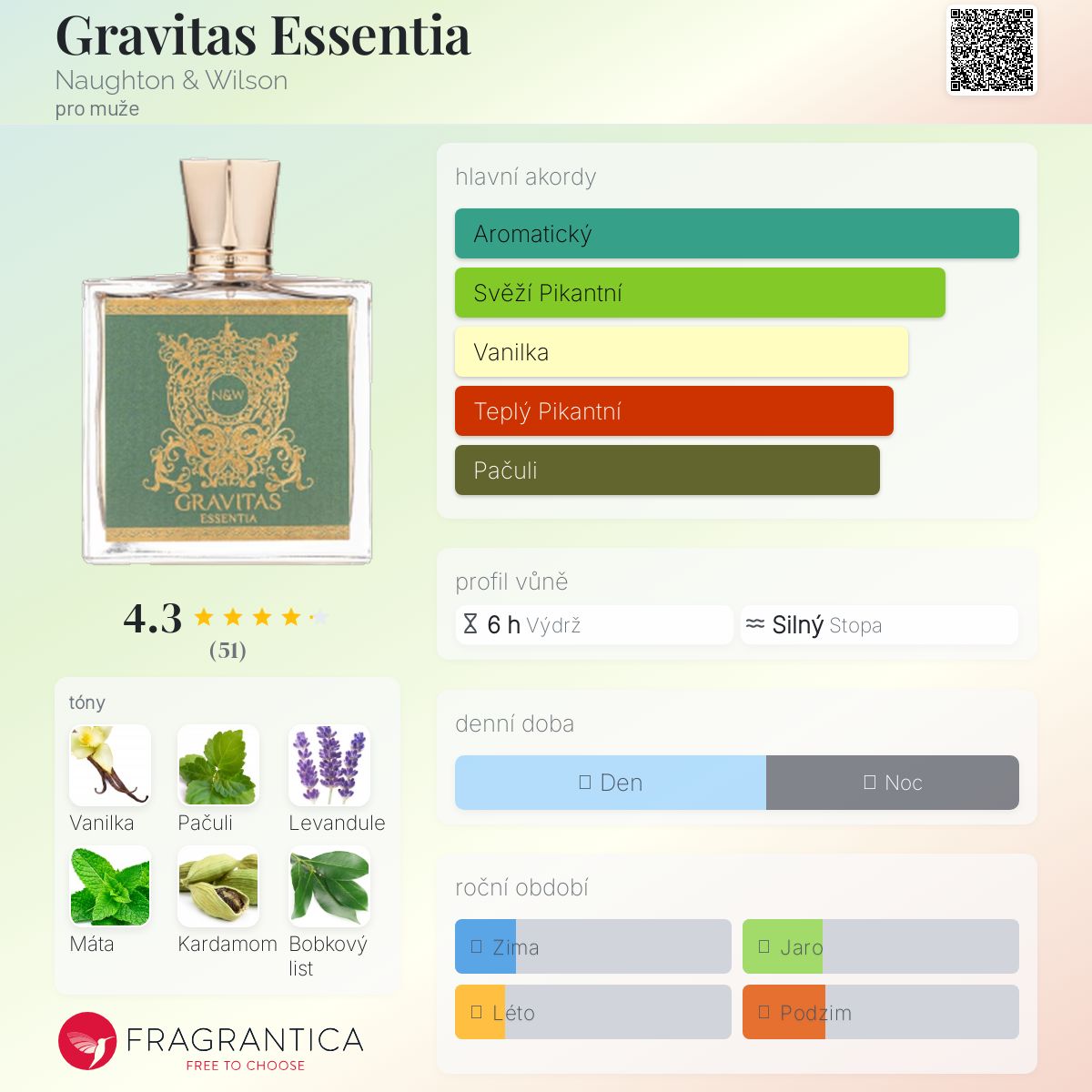 Gravitas Essentia podle Naughton & Wilson je Aromatic Fougere vůně pro muže. Gravitas Essentia byl/a uveden/a v roce 2023. "Nosem" za touto vůní je John Stephen. Vrchní tóny jsou Levandule, Máta, Bergamot a Mandarinka; střední tóny jsouKardamom, Bobkový list, Koriandr a Pelyněk ; základní tóny jsou Vanilka, Pačuli, Dubový mech a Ambra.