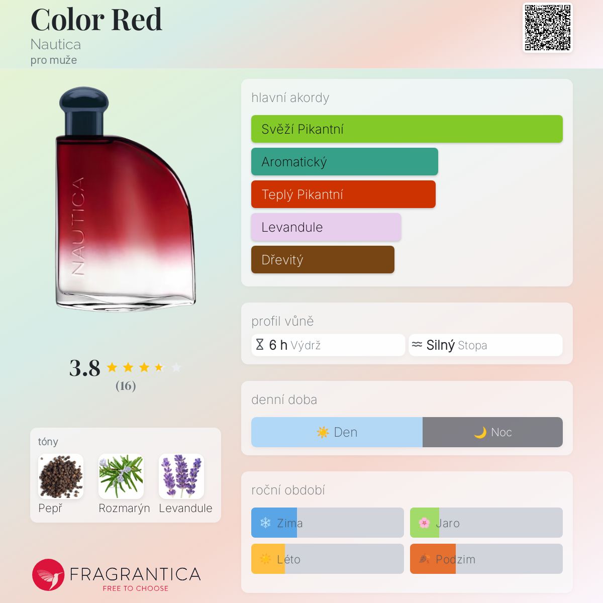 Color Red podle Nautica je Aromatic vůně pro muže. Toto je nová vůně. Color Red byl/a uveden/a v roce 2025. Vrchní tón je Černý pepř ; střední tón jeLevandule ; základní tón je Rozmarýn.