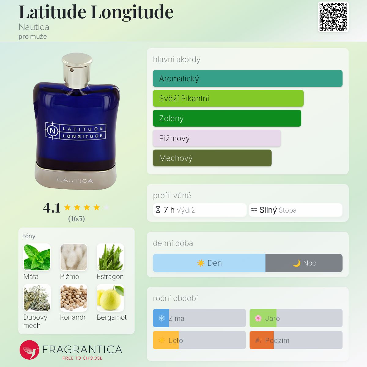 Latitude Longitude podle Nautica je Woody Floral Musk vůně pro muže. Latitude Longitude byl/a uveden/a v roce 2000. "Nosem" za touto vůní je Harry Fremont. Vrchní tóny jsou Estragon, Koriandr a Bergamot; střední tóny jsouVodní máta, Pačuli, Muškátový oříšek a Černý čaj ; základní tóny jsou Pižmo, Dubový mech a Jantar (ambra).
