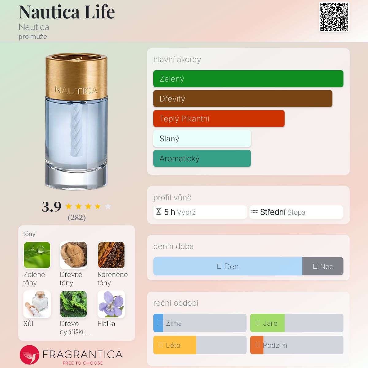 Nautica Life podle Nautica je Woody Aromatic vůně pro muže. Nautica Life byl/a uveden/a v roce 2014. Vrchní tóny jsou Mořská sůl, Zázvor a Šalvěj; střední tóny jsouFialka a Levandule ; základní tóny jsou Cypřišek tupolistý a Mech.