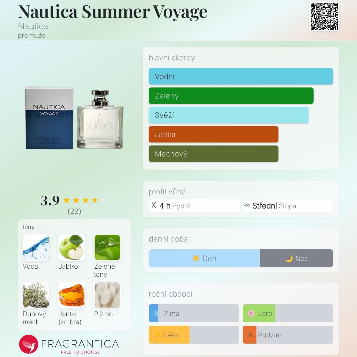 Nautica Summer Voyage podle Nautica je Aromatic Aquatic vůně pro muže. Nautica Summer Voyage byl/a uveden/a v roce 2009. Vrchní tóny jsou Granny Smith jablko a Zelené tóny; střední tón jeVodní tóny ; základní tóny jsou Dubový mech, Jantar (ambra) a Pižmo.
