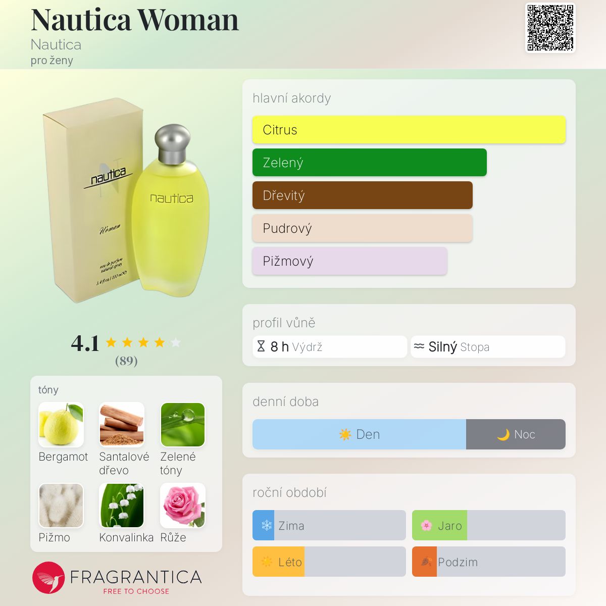 Nautica Woman podle Nautica je Floral Green vůně pro ženy. Nautica Woman byl/a uveden/a v roce 1997. Vrchní tóny jsou Bergamot, Grapefruit a Mandarinka; střední tóny jsouZelené tóny, Konvalinka a Růže ; základní tóny jsou Santalové dřevo, Pižmo a Jantar (ambra).